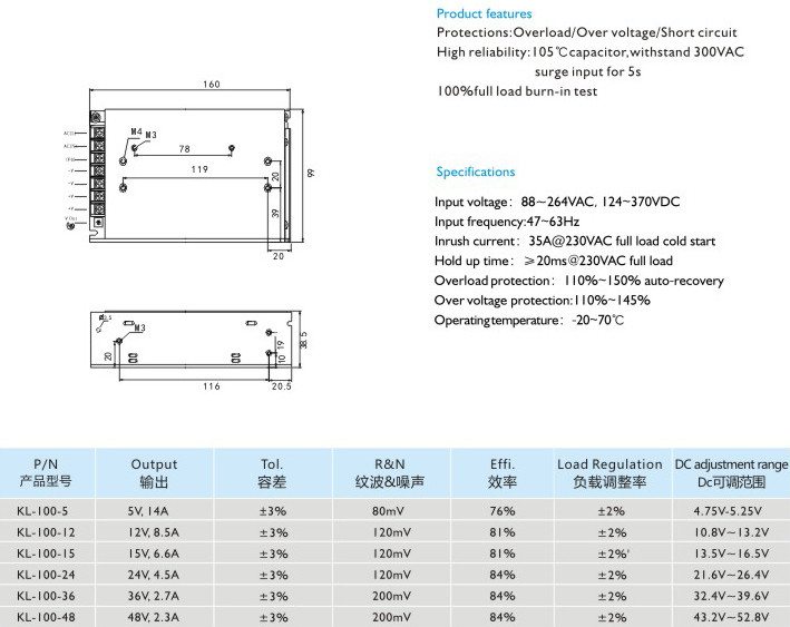 高可靠性:105C長壽命電容,能承受300VAC輸入電壓5秒不損壞 100滿載老化測(cè)試 輸入電壓:88-132VAC,176-264VDC,249-370VDC 輸入頻率:47~63Hz 沖擊電流:35A@230VAC滿載冷態(tài) 保持時(shí)間:≥20ms@230VAC滿載 過載保護(hù):110%-150%自動(dòng)恢復(fù) 過壓保護(hù):110%~145% 運(yùn)行溫度:-20-70℃" />